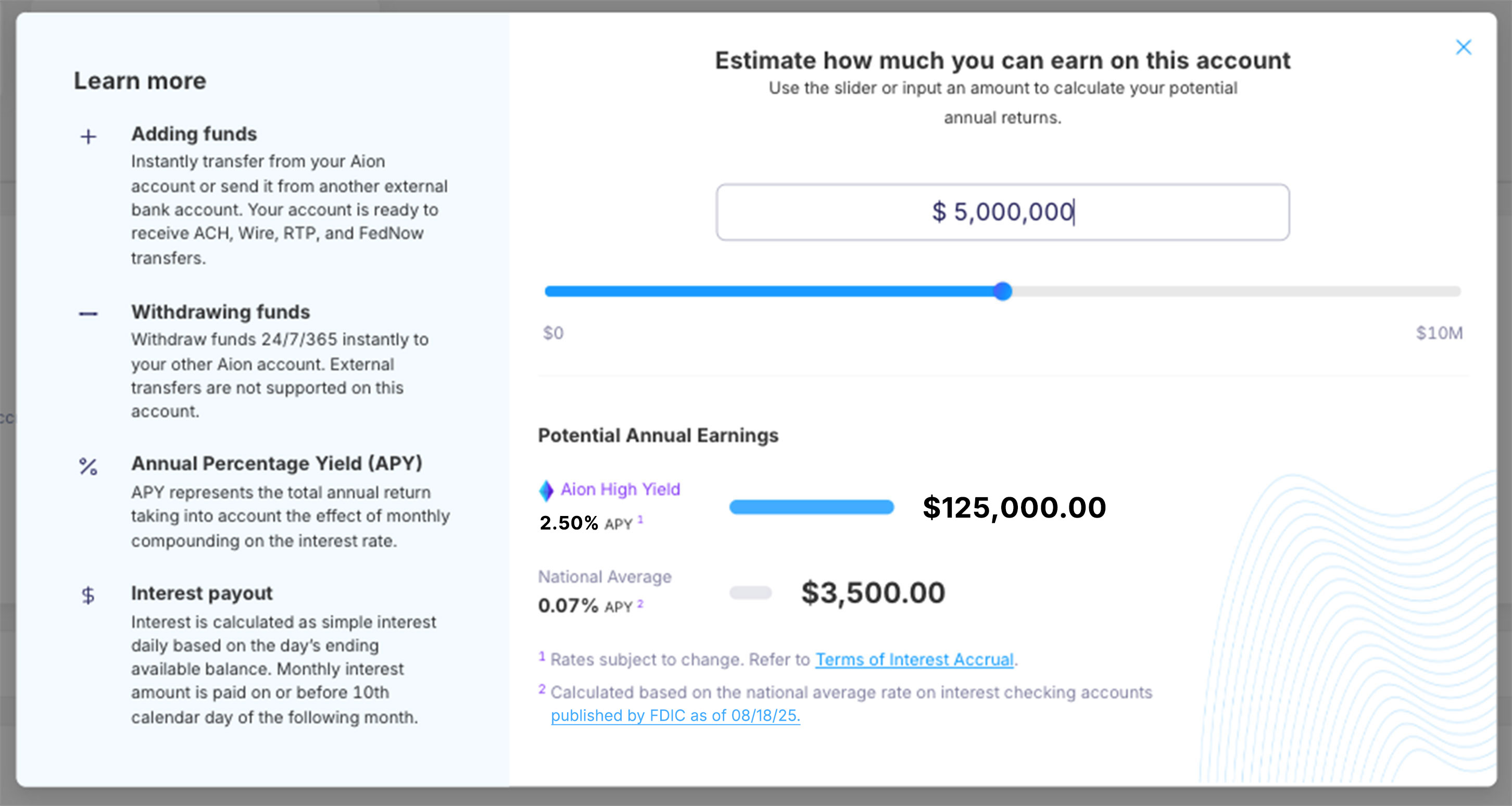 Aion's High-Yield account allows business revenue to accrue interest while it's stored, yet funds are always readily accessible at any time for investments, operational costs or unforseen circumstances. If you're saving funds for taxes or capital expenses, this money can earn interest until it's ready to spend.
